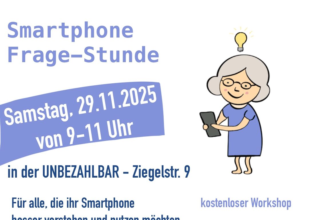 am 29. Nov.,  9 -11 UhrFür alle, die ihr Smartphone besser verstehen und nutzen möchten.Samstag, 29.11.2025 von 9-11 Uhr kostenloser Workshop in der UNBEZAHLBAR Ziegelstr. 9.Kurze Einführung: Grundfunktionen, Menüführung, einfache Alltagstipps. Anschließend offene FragerundeBitte ein aufgeladenes Smartphone mitbringen (ggf. Ladekabel). Wir freuen uns auf Sie und Ihre Fragen!
