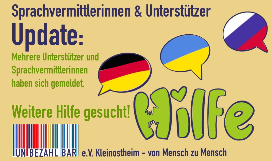 Menschen in Kleinostheim, die ukrainisch oder russisch sprechen. Es haben sich schon einige gemeldet toll – jede/r wird gebraucht, um Familien, die Geflüchtete aufnehmen, zu unterstützen.